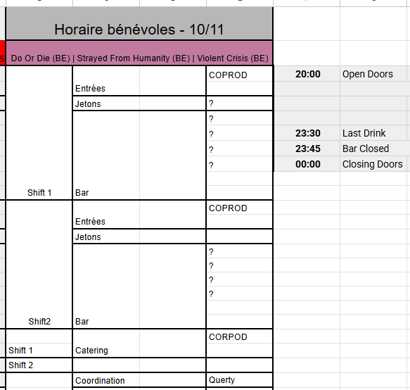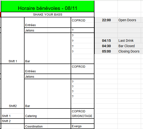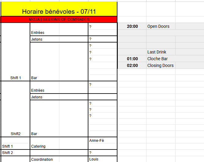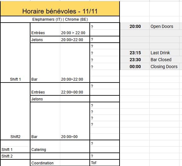Bonjour à tous, On a encore besoin un peu (beaucoup) de vous... ???? ???? *Vendredi 07/11* : 2ᵉ shift *BAR* de *23h15 à 02h30* ???? *Samedi 08/11* : 2ᵉ shift *BAR* de *01h45 à 05h30* ???? *Mardi 11/11* : *Entrées* * 1er shift : *20h à 22h* * 2ᵉ shift : *22h à 00h* Il nous manque encore *une personne pour le 2ᵉ shift BAR de 22h à 00h*. ????????????????Et on cherche un *binôme pour la cuisine avec Touffu*. Est-ce que quelqu’un qui a une voiture serait *chaud patate* pour former un binôme avec lui (courses, prépa, rangement) ? ???????? Merci d’avance à tous ! ???? Elodie. Le 31-10-25 à 15:43, Elodie Laurent a écrit :