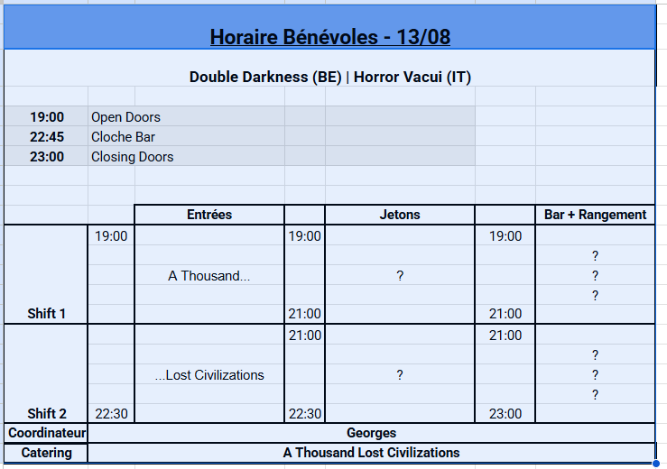 Bonjour à tous, Ce Mercredi 13, Nous accueillons "A THOUSAND LOST CIVILIZATIONS" qui programme Double Darkness (BE) | Horror Vacui (IT) <https://www.facebook.com/events/1210788447492131?active_tab=about&__cft__[0]=AZWVYyflMrW3wfmIh2WLJvbZT7S-xlnlj6dWp7eM5IDRLQbDb-Lh5HMWzhwse4QZUV33tUxSwWWDjpW5ZaRGzZAmZi7gW_uB9M6lUo3eDKL9cUIO9M2LOyhkgD759Y0CTOynqc6dlEzKkA7ELP3qDD2A&__tn__=-UK-R>https://www.facebook.com/events/1210788447492131... <https://www.facebook.com/events/1210788447492131?active_tab=about&__cft__[0]=AZWVYyflMrW3wfmIh2WLJvbZT7S-xlnlj6dWp7eM5IDRLQbDb-Lh5HMWzhwse4QZUV33tUxSwWWDjpW5ZaRGzZAmZi7gW_uB9M6lUo3eDKL9cUIO9M2LOyhkgD759Y0CTOynqc6dlEzKkA7ELP3qDD2A&__tn__=-UK-R> *????Et on a besoin de vous*!!???? Que vous soyez dispo pour un*petit shift*ou pour*toute la nuit*, votre aide sera plus que précieuse. Si vous êtes interressé faites moi savoir! ???? *????Merci d’avance à tous !???? * * * *Elodie Laurent* Assistante Administrative et Logistique PANAMA ASBL - Belvédère Namur Avenue Marie d'Artois, 1 5000 Namur 081/81.39.00 www.belvedere-namur.be <http://secure-web.cisco.com/1i8nQvlu6oDj7cuIr5wpZMGdUmKHQB_LRRmv5hY7oaRqGXX85FmVfZWf40mwMwcU3Jv946T0HGfHDMyKW12e5gS_uGqg0-wVEtnPLXCFYOVunF7GBF9YIBfqeUqktn7WnuX-GB4qVKtTiany8mFLKcgg6TLLq-poR8ICUo02PVCZ4u7UkhI37PgU0kVpti5PeCyqnvXVMpX5HmG3UhBQmOjlDT6YOf_v0-wcDVLc3WUxAEEhf6h7cAVvvhT8tG3Pj/http%3A%2F%2Fwww.belvedere-namur.be%2F> **