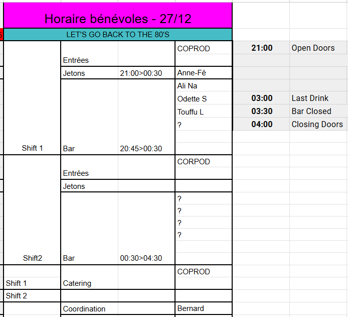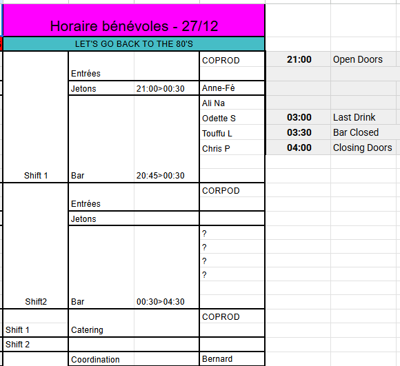 Bonjour à tous, Nous cherchons encore des bénévoles pour THE LAST BUT NOT LEAST! La fameuse soirée Let's Go Back to the 80'S par Stefke Van Namen.???????? Si vous êtes intéressés ne manquez pas de vous manifester.* Nous devons avoir clôturé* l'organisation de cette soirée, dont les horaires* cette semaine*. Pcq après paraît qu'on doit prendre des vacances après...???????? Belle journée à vous. [image: Capture d'écran 2025-12-16 101136.png]