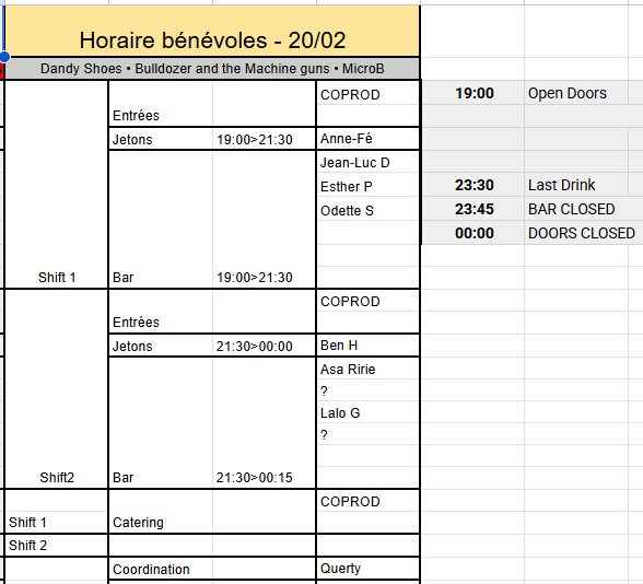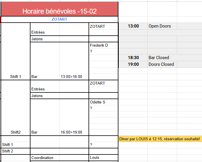 Bonjour à tous, Pour ceux qui ne l'auraient pas vu sur Facebook, voici les appels à bénévoles pour les 3 prochaines dates. (*Horaire ci-dessous*) 1. *Ce Dimanche 15/02 - ZOTART* Edition Saint Valentin des rencontres ZOTART!❤️❤️ *Love is in the air.❤️❤️* https://www.facebook.com/events/2138248633249376 On a encore besoin d'une personne par shift au bar.???? (C'est en après-midi et jusque 18h30). Possibilité de dîner???? à 12h15, *réservation obligatoire* auprès de Louis.????