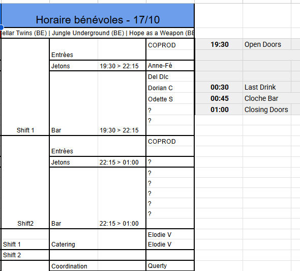 Bonjou à tous, Ce *vendredi (demain !)*????, *CELLAR TWINS* revient au *Belvédère* pour mettre le feu ! ???????? On a besoin de vous pour assurer le service des *pintjes et autres breuvages *???? ???? Il nous manque encore du monde, *surtout pour le second shift au bar*. Les concerts de CELLAR TWINS sont généralement *archi-complets*, donc on aura besoin de vous pour offrir *un service du feu de djeu*, comme vous savez si bien le faire ???? Si vous êtes dispo, *faites-moi signe rapidement* ! Merci d’avance à tous, Elodie.