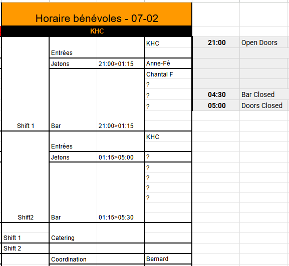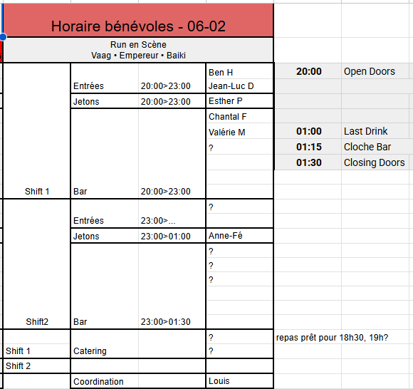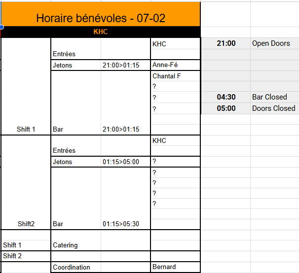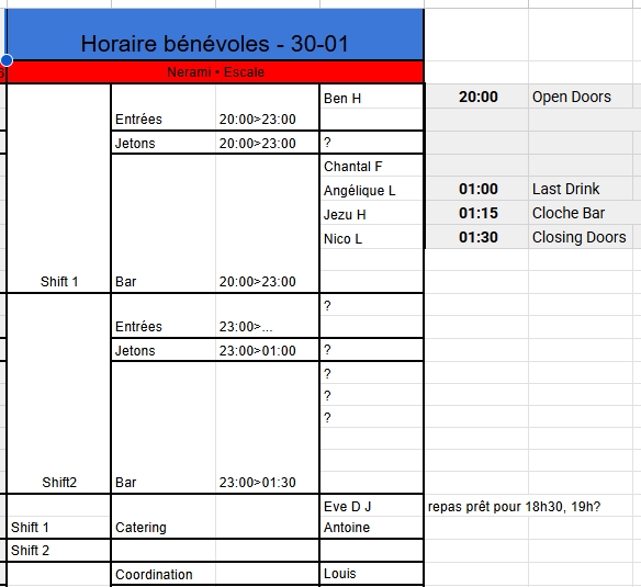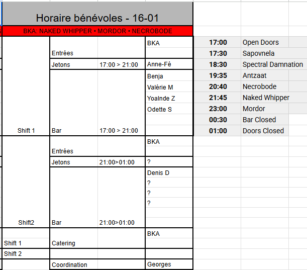 [image: ⚠️] Petite particularité importante : Si nous n’arrivons pas à constituer une équipe de 4 bénévoles pour le second shift au 24/01, nous ferons appel à des jobistes pour tout le second shift [image: ????♂️][image: ????] C’est principalement sur ces soirées et horaires que nous butons (voir les 80’s de décembre en exemple). On comprend bien que la plupart d’entre vous préfèrent le rock ou le metal [image: ????][image: ????] et que ça fini tard, donc on anticipe [image: ????] [image: image.png]