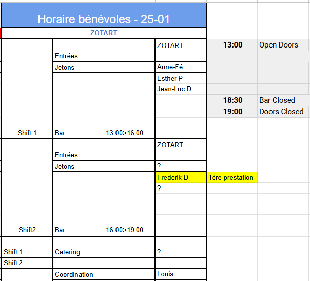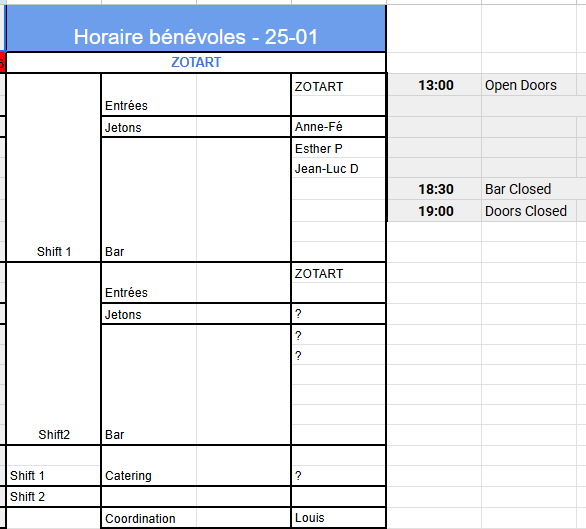 Salut les copains [image: ????] J’espère que vous avez bien clôturé 2025 [image: ????] et que 2026 démarre sous les meilleurs hospices [image: ????][image: ✨] On ne va pas chipoter : je vous balance les 5 premiers appels à bénévoles de l’année [image: ????][image: ????] Comme ça, c’est fait, et on a l’esprit libre pour faire d’autres choses… du sport [image: ????♂️], ou je ne sais quoi [image: ????] [image: ????] VENDREDI 16/01 — BLACK KHAOS Black Khaos revient avec une toute grosse soirée [image: ????][image: ????] On a besoin de toi aux jetons [image: ????] et au bar [image: ????]. [image: Capture d'écran 2026-01-13 111024.png] DIMANCHE 25/01 — ZOTART On accueille pour la seconde fois ZOTART, qui propose une scène ouverte en après-midi [image: ????][image: ✨] On a besoin de quelques personnes pour soutenir Louis au bar [image: ????] et aux jetons [image: ????]. Si quelqu’un est chaud pour préparer un petit casse-dalle [image: ????], c’est cool aussi [image: ????]