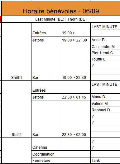 Bonjour à tous????, Ce samedi, nous acceuillons "Last Minute" qui fête ses 15 ans, ainsi que Thorn pour sa première partie! L'occasion de pousser la chansonnette sur vos grands classiques, soirées festive en perspective. *On a besoin de vous*!! Pour gérer le service au bar, la vente de jetons, ,... ET une équipe pour le "catering bénévoles" uniquement!???????? Si vous avez envie d'être de la partie, ne manquez pas de nous faire signe à Anne-Lise et moi. *❤️Merci d’avance à tous !❤️ * *Une très belle journée.* ** --